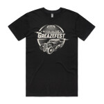New for 2025 – our GreazeFest 25th Anniversary tee, featuring a custom design by Ger Peters with a 1963 Thunderbird, crossed flags, and a black Gretsch guitar set against a bold shield background.